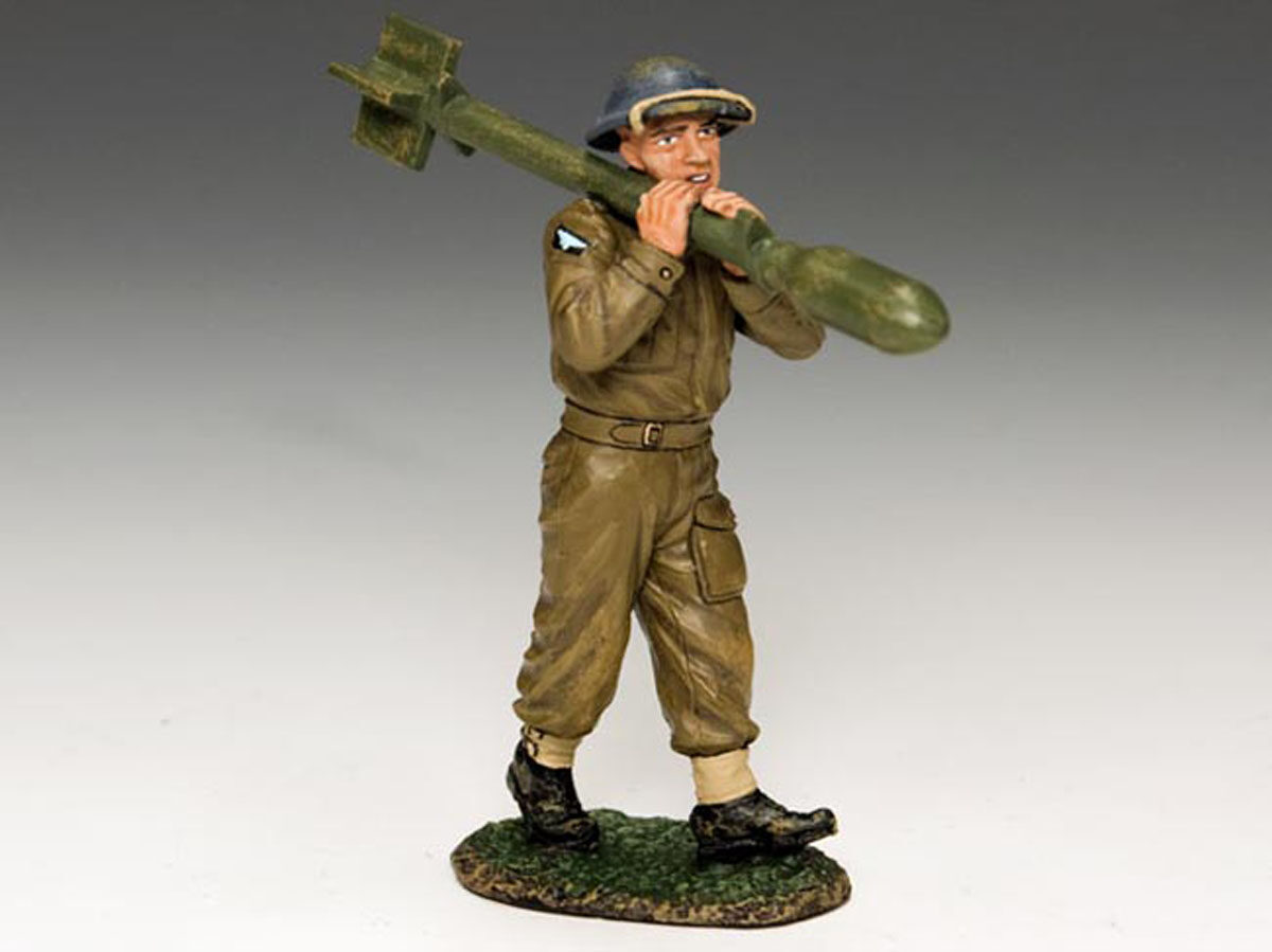 Un membro dell’equipaggio di terra della RAF trasporta uno dei razzi per l’aereo.