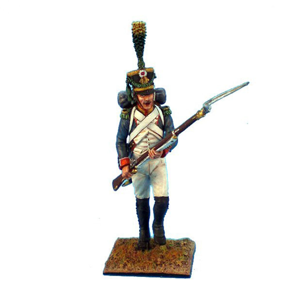 Volteggiatore francese in uniforme completa che avanza col moschetto sollevato