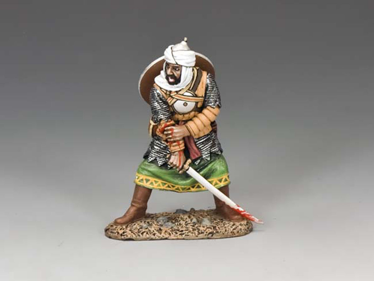Wounded. Clutching his wounded sword arm this Saracen glares defiantly at his oncoming opponent.